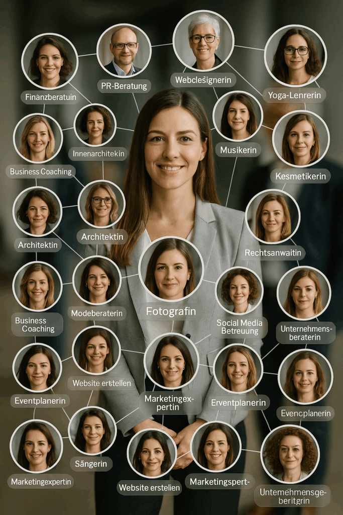 Hier findest Du: Architektin, Business Coaching, Eventplanerin, Energetikerin, Finanzberaterin, Fotografin, Grafikdesignerin, Innenarchitektin, Kosmetikerin, Künstlerin, Marketingexpertin, Modeberaterin, Musikerin, Personal Trainerin, PR-Beratung, Rechtsanwältin, Sängerin, Social Media Betreuung, Steuerberaterin für Selbstständige, Therapeutin, Unternehmensberaterin, Webdesignerin, Website erstellen, Yoga-Lehrerin und vieles mehr…