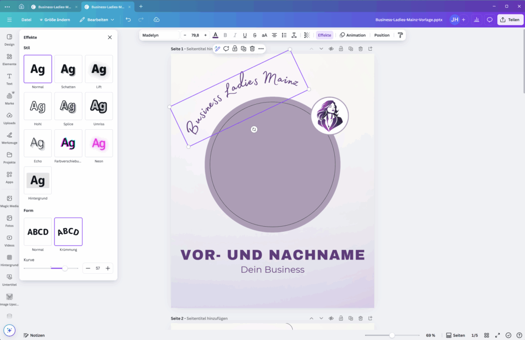 - Bitte beachte folgenden kleinen Workaround: Leider wird der Schriftzug Business Ladies Mainz ohne Krümmung gespeichert. Das lässt sich ganz einfach korrigieren: Seite 1 – Schriftzug markieren – Oben in der Zeile über dem Bild auf “Effekte” klicken – In der Box links unten “Form” auf “Krümmung” und “Kurve” 57 einstellen
